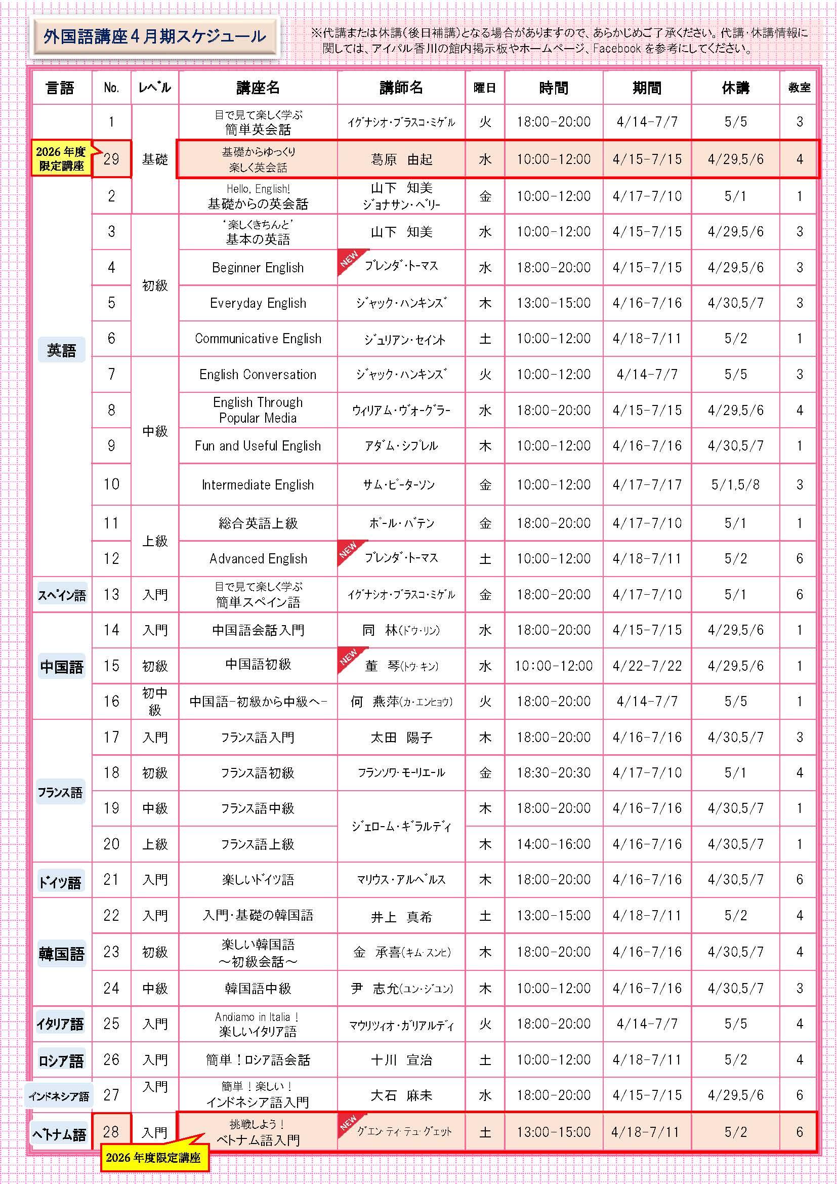 ※2026年度4月期外国語講座休講・代講・変更情報はこちら