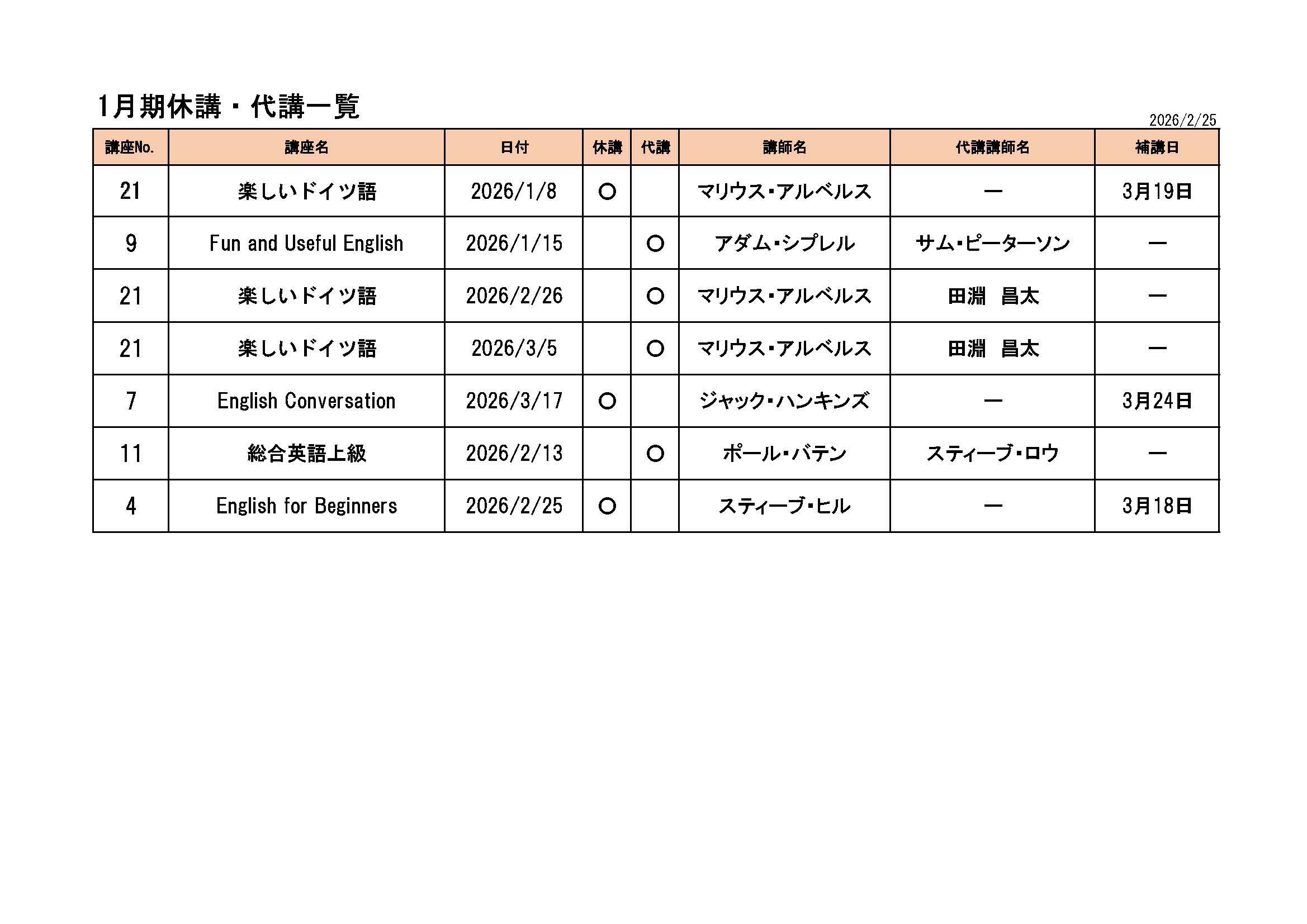 2025年度外国語講座休講・代講のお知らせ