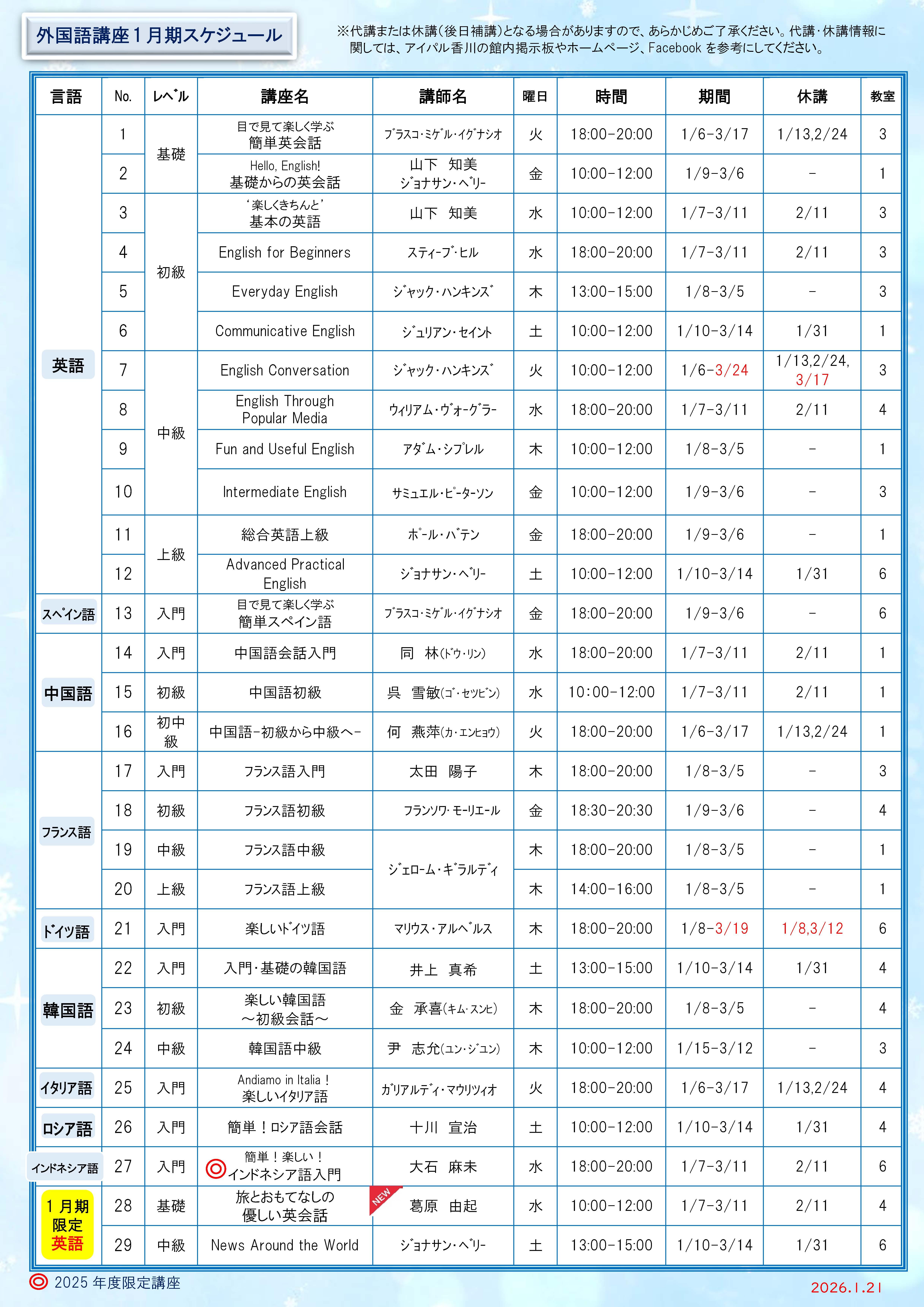 ※2025年度1月期外国語講座休講・代講・変更情報はこちら(1月31日更新)