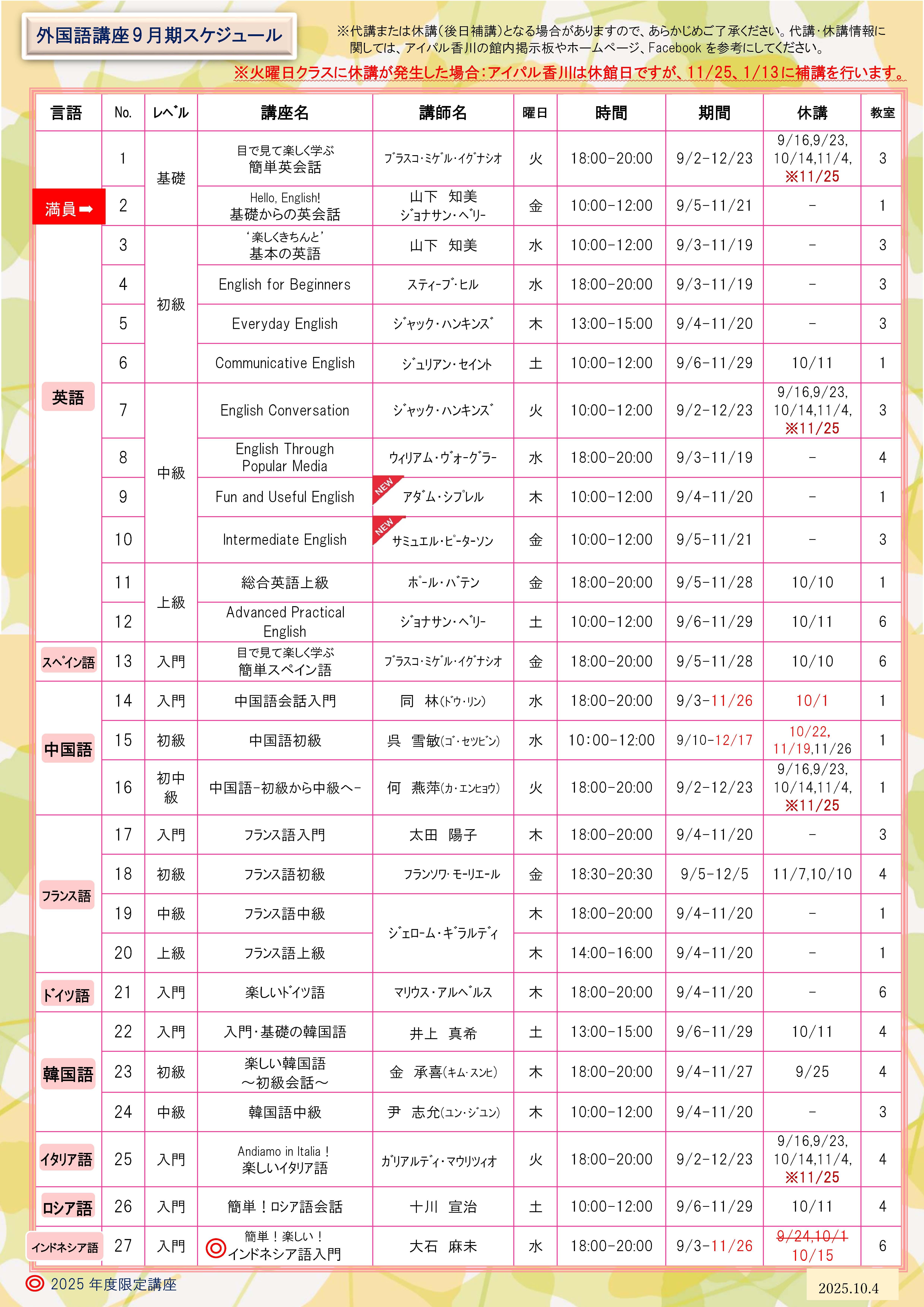 ※2025年度外国語講座休講・代講・変更情報はこちら(10月4日更新)
